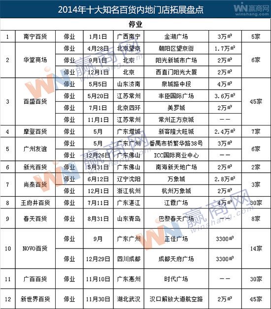 广州友谊、NOVO百货则关闭了2家门店。外资百货尚泰百货也因“水土不服”等问题,关闭了2家门店。另外,王府井百货、南宁百货、摩登百货、新光百货、春天百货、广百百货、新世界百货等则分别关闭1家门店。