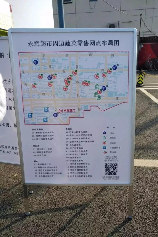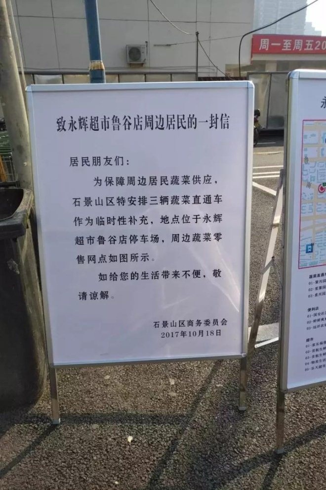 在这个临时集市的旁边,亿邦动力网发现了石景山区商委的公开信,信中没有提及永辉超市的停业原因,仅仅告知了临时集市的合法性,同时附上了周边的蔬菜零售网点。