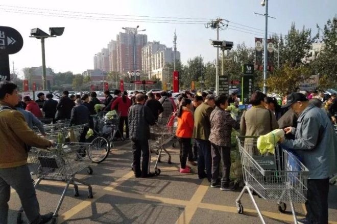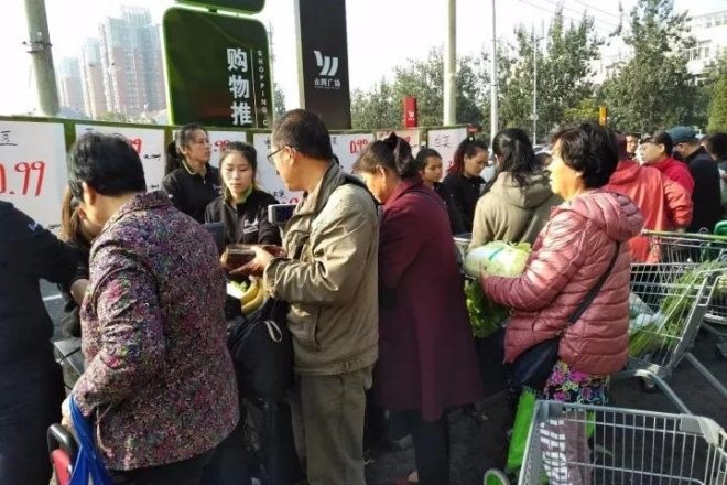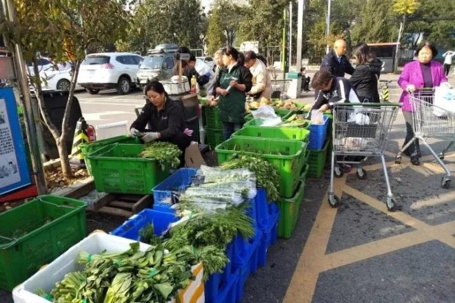 超市旁停了三辆蔬菜直通车,在永辉超市闭锁的西门外竟用蔬菜配送框和超市手推车支起了一个临时的蔬果集市,不少附近居民都在这里挑选和购买水果,也有一些居民在不停地打探关店原因。五六台电子秤和结算台一字摆开,平时冷清的超市停车场忽然变得好不热闹。