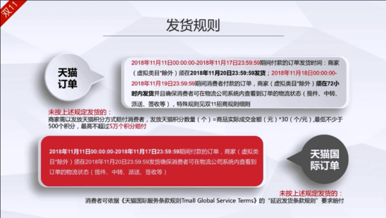 1、关于发货的问题,以往双11天猫只会对11.11-11.17的订单发货时间进行特殊说明,但大家也知道即使17号过了后物流的压力仍然存在,所以天猫今年针对18-20号的订单的发货时间,要求在72小时内完成发货。