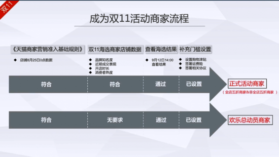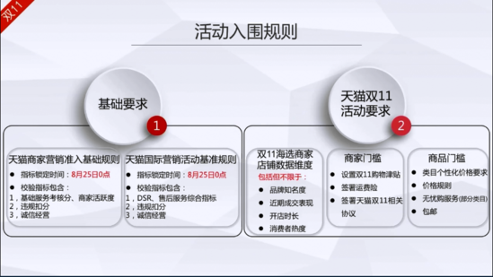 天猫方面表示,本次招商规则的重点之一是商家准入规则要求,这个是决定商家能否成功报名双11的重要因素之一,以往的双11如果商家有其中一项指标不达标就不能报名活动了,那么今年在7月底上线的营销新规中,考核的是商家的综合能力,对于今年双11相关的数据是看商家8.25日0点的相关数据是否达标。
