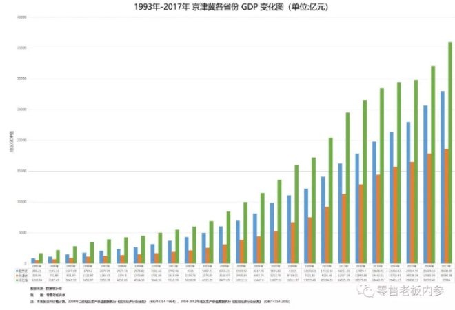 1993年-2017年京津冀各省份GDP变化图(单位:亿元)
