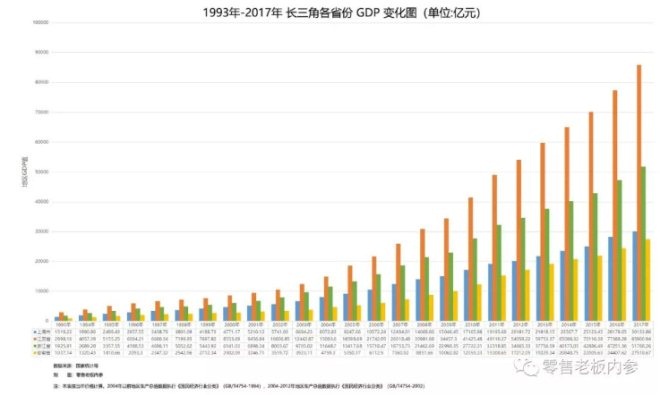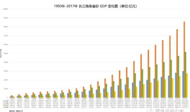 1993年-2017年长三角各省份GDP变化图(单位:亿元)