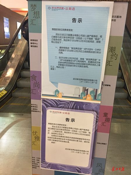 电梯停止运行。在电梯入口扶手上,贴着一张告示:因业主万顺置业进入破产程序,已解除武汉新世界百货汉阳店的租赁合同。“我店将于2018年12月30日起闭店。”并告知通知VIP顾客,及时到店兑换积分,也可在新世界其他分店进行积分兑换及使用。落款时间是“2018年12月1日”。