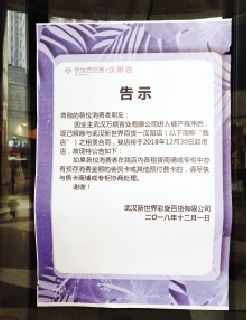 大门公告显示,“因业主武汉万顺置业有限公司进入破产程序后,现已解除与武汉新世界百货汉阳店的租赁合同,我店将于2018年12月30日起闭店。并提醒有预存消费金额卡的消费者尽快与售卡专柜协商处理”。