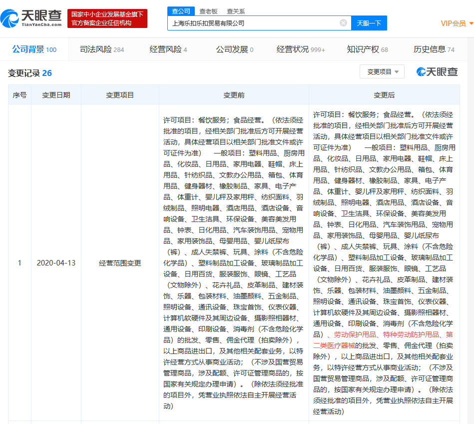 天眼查数据显示,4月13日,上海乐扣乐扣贸易有限公司发生工商变更,经营范围新增劳动保护用品、特种劳动防护用品、第二类医疗器械的批发、零售、佣金代理。