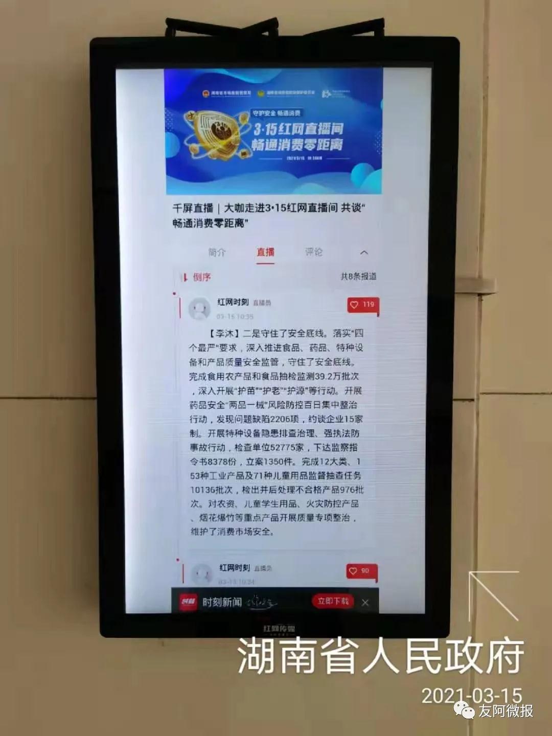 龙商网消息:3月15日上午,“3.15红网直播间”开播。湖南连锁经营协会会长、友阿公司董事长胡子敬做客直播间。此外,湖南省市场监督管理局副局长、省消费者权益保护委员会副主任李沐,红网新媒体集团总编辑贺弘联也走进了直播间。