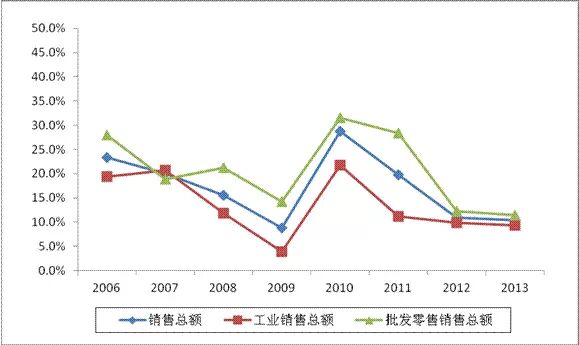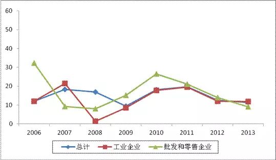 图 2 2006-2013年工业、批发和零售业企业销售总额增长情况(单位:%)