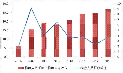 图 17 2006-2013年物流人员劳动报酬增长情况(单位:%)