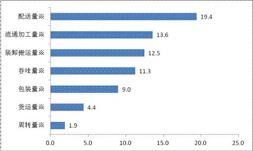 2013年物流企业货运量比上年增长4.4%,货运周转量增长1.9%,配送量和装卸搬运量增长19.4%和12.5%。除周转量增幅同比提高0.2个百分点之外,货运量、配送量、装卸搬运量增幅分别回落0.1个,1.3个和2.4个百分点。