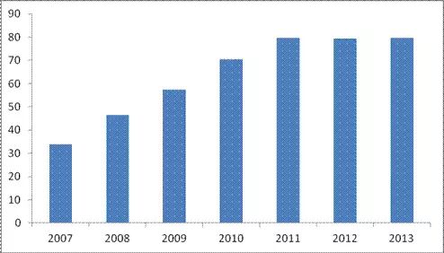 图 11 2007-2013年工业、批发和零售业企业委托代理货运量占比情况(单位:%)