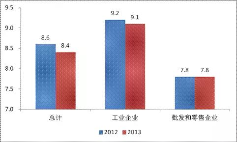 2013年工业、批发和零售业企业销售总额比上年增长10.4%,增幅同比回落0.5个百分点。其中,工业企业销售总额增长9.3%,批发和零售业企业销售总额增长11.4%,增幅分别回落0.5个和0.8个百分点。尽管企业销售总额增幅小幅回落,但仍保持平稳较快增长。