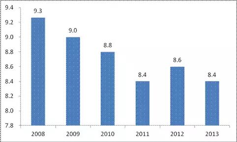 图 7 2006-2013年工业、批发和零售业企业物流费用率情况(单位:%)