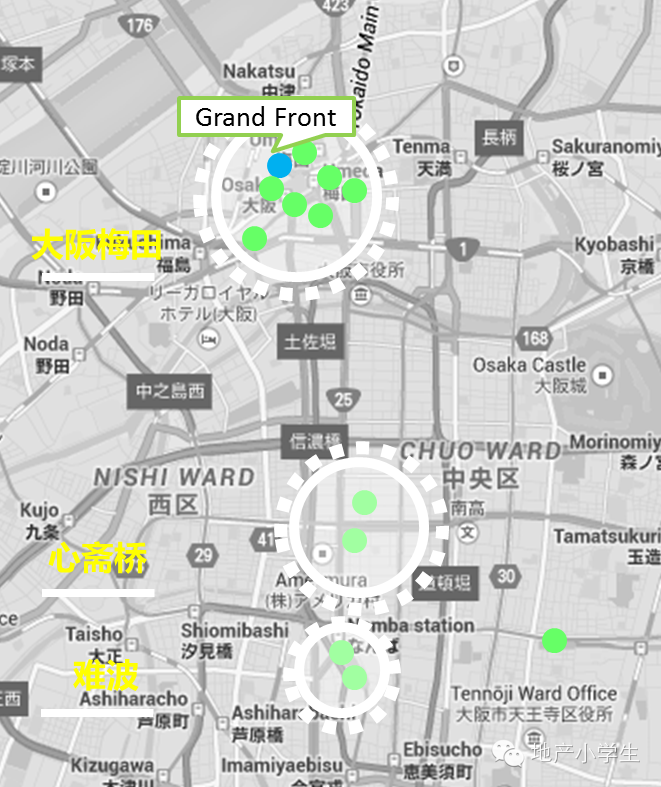 图二则是大阪市主要商业体(包括大型百货和购物中心)的分布图。肉眼就可以直观感觉到,Grand Front周边商业的密集程度,包括阪急、大丸、三越伊势丹、HEP FIVE等等商业体。所以,这里也被称为仅次于东京银座的的日本第二大商圈。