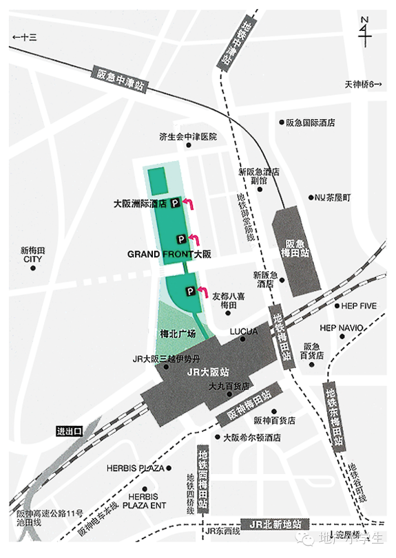 图一是标注了Grand Front 周边的道路交通环境,我们看到有7条轨道交通线路经由附近,包括城市火车站及城际轨道交通线路,包括JR、阪急、阪神,以及城市地铁系统包括御堂筋线、四桥线等,共7个站点(是的,日本的轨道交通炒鸡复杂,大家有兴趣以后可以分享)。其中,Grand Front与西日本最大的火车站—JR大阪站有在天桥和负一层相连。这些轨道交通站加起来每天的人流量约为230万人次左右,而JR大阪站的人流量约为每天81万人次。