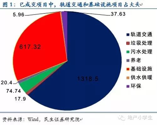 根据民生证券研究院,Wind的资料显示,我国目前的PPP还主要集中在公共服务领域、轨道交通、基础设施、环保、垃圾污水处理这些行业有长期积累的龙头企业,其中轨道交通领域占到一半以上,其次是基础设施建设领域,约占三成。