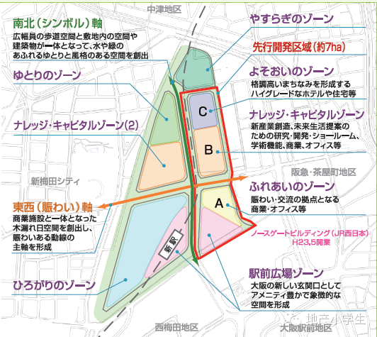 于是在UR的牵头之下,联合包括大阪府、大阪市、铁路运输机构、关西经济协会等共同为大阪站北地区的改造进行国际招标,并根据根据2002年举办的国际理念设计大赛入围方案的创意,2004年大阪市制定了“大阪站北地区城市建设基本规划”,确立了片区发展的五点基本方针: