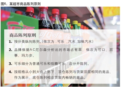 有了准备上架的商品后,品类经理需要确认消费者的决策树和整体的陈列原则。不同的品类存在多种的货架陈列原则:高价/高利润策略、大包装陈列方式、着重商品陈列、相关品类关联陈列、品牌相关陈列、消费者决策树陈列、功能陈列、核心商品黄金线陈列、纵向陈列。(如图6所示)