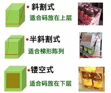 在一些店铺的过道上,常能看到整箱陈列的商品箱子上被割开一个斜角,过往的顾客可随意从中拿到想要的商品,十分便捷。这种陈列方式易于搬动,且商品陈列比较紧凑,可以节约店内空间。“割箱陈列”广泛被中小超市、店铺应用,更适用于饮料等快速消费商品。