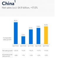 龙商网消息: 11月19日,沃尔玛发布截至2024年10月31日的第三财季财报,其全球总营收同比增长5.5%至1696亿美元。 截至10月31日的第三财季,沃尔玛中国净销售额达49亿美元(约合355亿元)、同比增长17.0%,增长动力主要来自山姆会员商店和电商业务,同时山姆会......