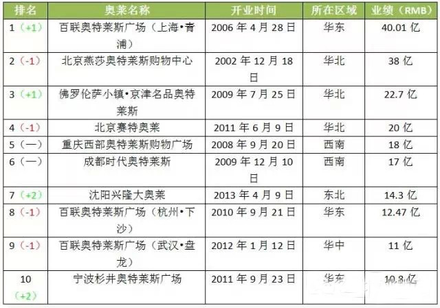 2014年,中国奥特莱斯业绩最佳的区域为华北和华东,分别有3家奥特莱斯入围,占了十强的大半,华中、西南、东北均有奥特莱斯入围,华南地区暂缺;奥特莱斯品牌最强的为百联集团,上海、杭州和武汉的奥特莱斯均入围,无锡百联奥特莱斯刚开业一年半,业绩也已达到9.28亿,已开业的四家奥特莱斯总体业绩达到了72.76亿。