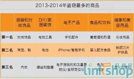 其他经常被盗取的产品包括电动工具、酒类、珠宝饰物、鞋类、智能手机、螺钉和垫圈、内衣、刀片、护肤品、化妆品以及美食。