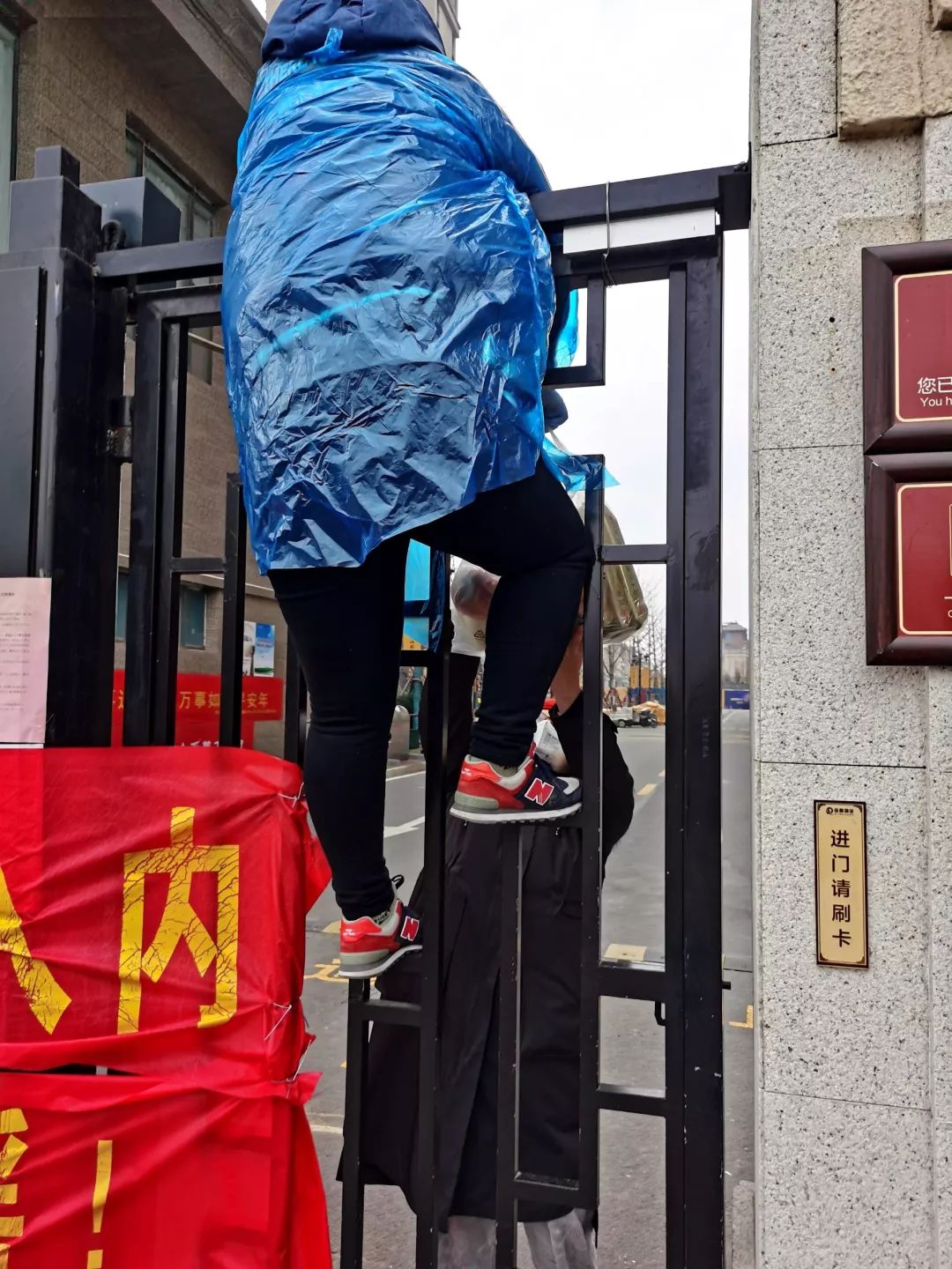 员工翟立伟,因为小区封闭门锁住,她只能爬到门上给顾客送货。