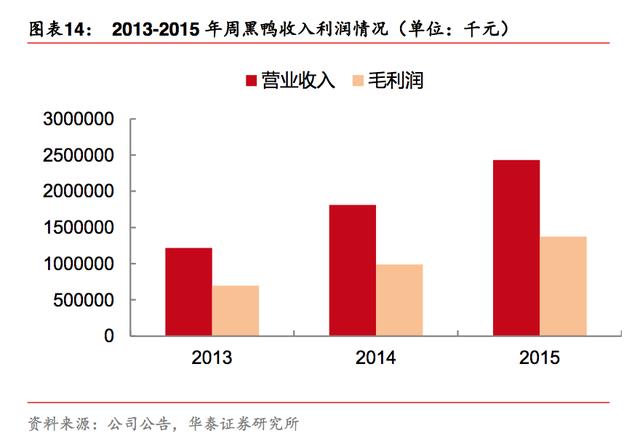 根据公司披露的文件显示,周黑鸭近年以来的销售收入保持着稳定较快的增长。2013 年 至 2015 年的营业收入分别为 12.17 亿元,18.09 亿元和 24.32 亿元,三年营业收入复合 增长率达到 41.3%。
