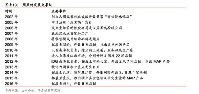 公司成立于 2002 年,经过十余年发展,已经成为休闲卤制 品行业市场占有率第二的企业。截至 2016 年 6 月,周黑鸭已在上海和武汉设立了加工厂, 在全国拥有 715 家直营销售点,覆盖中国 12 个省份,38 个城市。2015 年,公司销售收 入达 24.32 亿元,占中国休闲卤制品公司所产生收入总额的 6.8%。