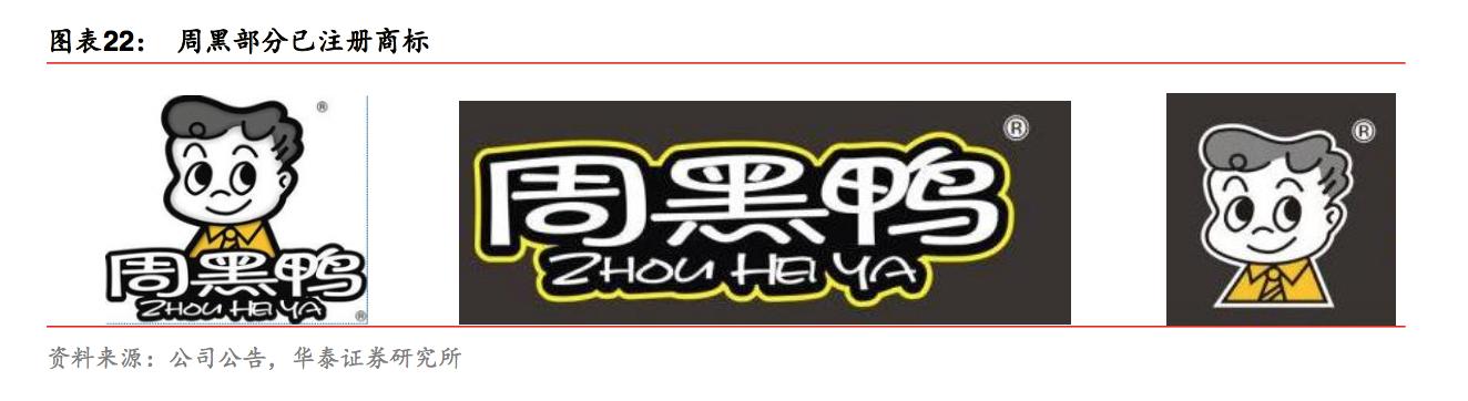 2011 年,周黑鸭被认定为中国驰名商标。除中国境内,周黑鸭还在中国香港、澳门特别 行政区、台湾地区以及新加坡、马来西亚、澳大利亚等国家和地区注册商标。从知识和产 权和品牌保护上,周黑鸭已为成为国际化的饮食企业打下了基础。