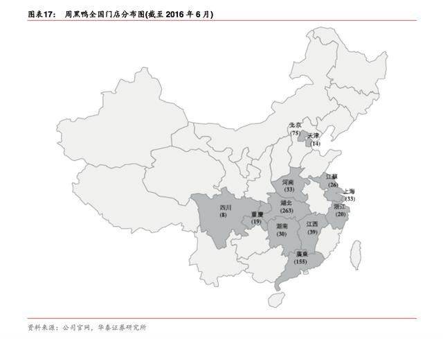在这些地区,周黑鸭产品的市场接受程度较高,甚至已经成为消费者日常生活的一部分。周黑鸭除了在发源地湖北拥有广泛的营业 点外,在北京拥有 75 家,上海 33 家,深圳 65 家。