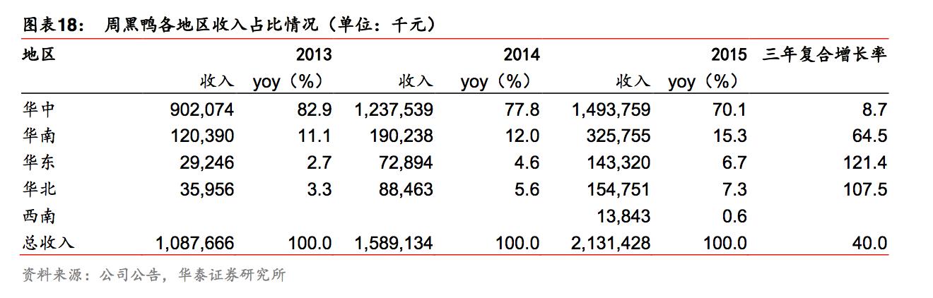 早期周黑鸭的主要市场集中在华中地区。截至 2015 年底,周黑鸭共计在全国经营 641 家 门店,其中在发源地湖北省就有 263 家门店。包括湖北、湖南、河南及江西省在内的华中 地区,共为周黑鸭赢得了 70%以上的营业收入。