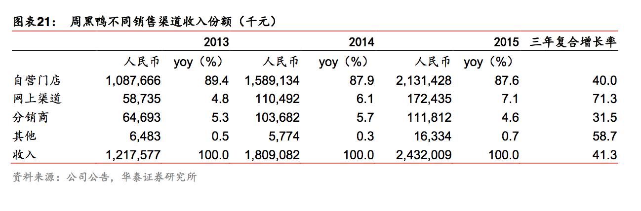 周黑鸭已在天猫、淘宝、京东、1 号店及苏宁等知名第三方网上商务平台开店,并积极参 与这些平台定时举办的优惠活动,如双十一购物节等。目前,周黑鸭的网上销售渠道于2013-2015 年产生的收入分别为 58.7 万元、110.5 万元和 172.4 万元。网上销售额初期占 比不大,但增速较快。