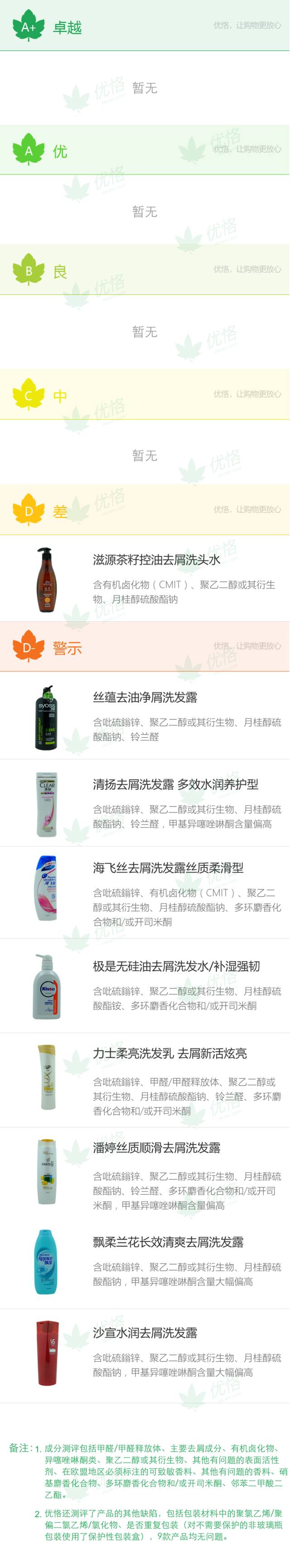 滋源茶籽控油去屑洗头水获差评(D),丝蕴、清扬、海飞丝、力士、潘婷、飘柔、极是和沙宣8款洗发水均获最低评级警示(D-)。