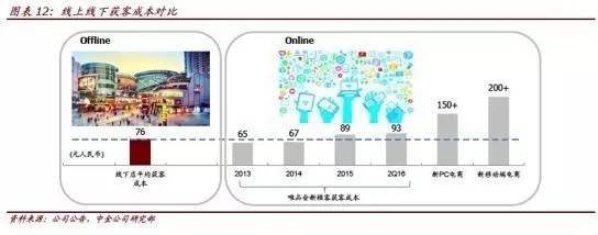 以国内较为成熟的电商平台唯品会为例,其获客成本已从2013 年的65 元,快速提升至2016 年二季度的93 元,预计其它新电商平台的PC 端的获客成本将超过150 元,移动端获客成本超过200 元。而目前一个典型的8 万平米购物中心,保守假设拥有年有效购物人次达100 万,合计获客成本为7600 万元,折算下来有效客户的平均成本仅为76 元,而且后续新增客户并不需要边际上产生其它的支出。这意味着,在线上获取新客户的效率已经低于线下门店。