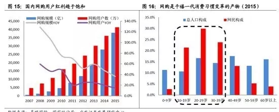 从线上渠道来说,网购经过多年的高速成长,2015年占我国社零额的比重达到15.2%,已超出美国、日本以及台湾等经济发达地区的水平;网购的流量红利渐入尾声,目前我国网购人数约4.13 亿人,占总人口比重约30%,与20 岁至40 岁人群(我国网购主力军)规模基本一致。随着网购群体增速的逐步放缓,未来新增客户的获客成本将呈逐步增加趋势。