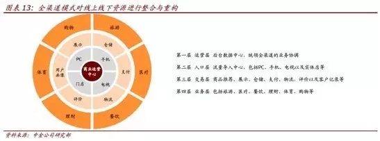 国美电器2016年已完成整体上市,并提出从“电子消费类零售商”转变为“线上线下融合的家庭整体解决方案提供商”,通过打造“娱乐休闲、生活美食、家装设计、互联网电视、智能物联、电子商务”六大场景形成前端平台,通过物流和全球化采购平台形成供应链张力为中台,通过服务云平台打造后台,进而形成前、中、后台强链接,为消费者提供整体解决方案,形成吃喝玩乐平台型大生态。