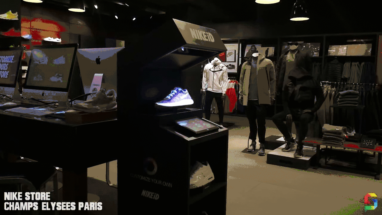 在巴黎的这家店内,消费者使用配备的平板电脑设计好球鞋的花色后,这双鞋就会立刻“真实”地出现在眼前——这是由于耐克采用了SmartPixels科技公司的AR投影技术。