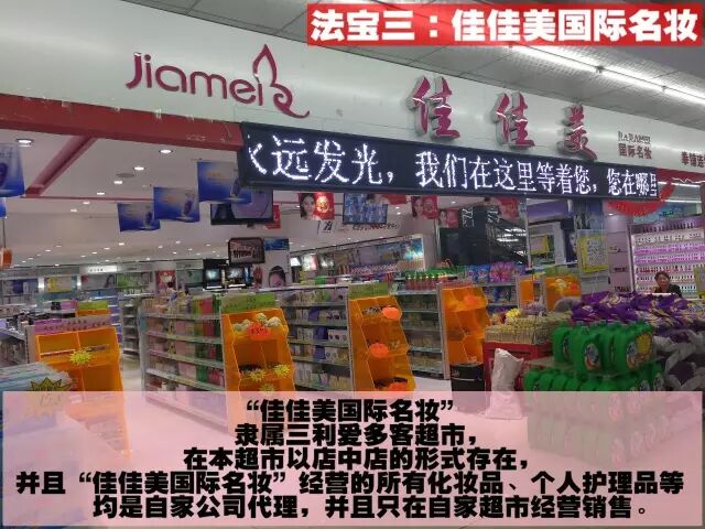 5、佳佳美国际名妆店,隶属于三利爱多客超市,所销售产品均是自己公司代理;