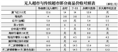与大超市比价中,以每袋210克黄飞红麻辣花生为例,永辉恒基中心店的售价为10.9元,这比无人超市里每袋12.6元的价格便宜1.7元;不二家棒棒糖20支粉色装在乐天超市售价14.2元,比无人超市一下子便宜5.7元。