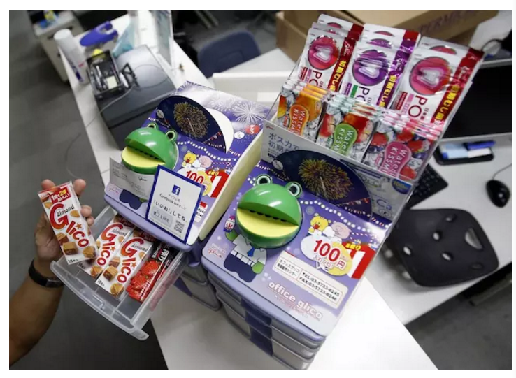 而根据日本时事通信社 JiJi Press 的说法,日本大型糖果糕点制造商江崎格力高(Ezaki Glico Co.)其实才是最早开始做办公室“无人小卖部”的商家,他们在 1998 年推出 Office Glico,抽屉样式的货柜里装满饼干巧克力等零食,消费者需要“自觉地”把钱投入货柜上的青蛙存钱筒里,商家会在在下一次补货时将货款收走。而即使设备遭遇小偷洗劫,江崎格力高也不会要求相关公司赔偿。