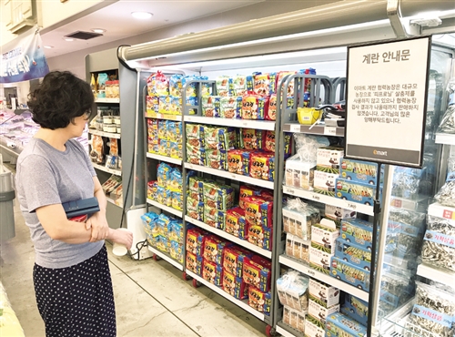 韩国首尔某大型超市打出“待合作农场完成检查工作后再行销售鸡蛋”的告示牌,并将鸡蛋全部下架,改用方便面等商品填充货架。经济日报记者 白云飞摄
