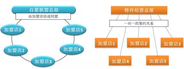 特许经营中总部与加盟店之间是一对一的契约关系,而自愿联盟是总部与各加盟店共同构筑的联盟关系;