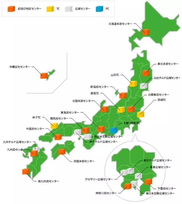目前,CGC共在全国建立了27个物流配送中心,其中包括8个有仓储功能并向区域总部和加盟企业直接配送的广域物流中心,14个含常温、冷藏、冷冻三温度带、向加盟门店混载配送的JD(Joint Delivery)联合配送中心,4个起补充配送功能的TC(Transfer Center)转运中心,以及一个2016年开始投入运营的生鲜PC(Process Center)加工中心。