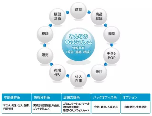 “大家的CGC系统”是CGC独自开发的面向区域型中小超市的骨干系统,整合超市主要业务与信息分析、后台办公等功能,由“主干系统”、“信息分析系统”、“通信工具”、“POP制作工具”组成,帮助加盟企业实现低成本运营。