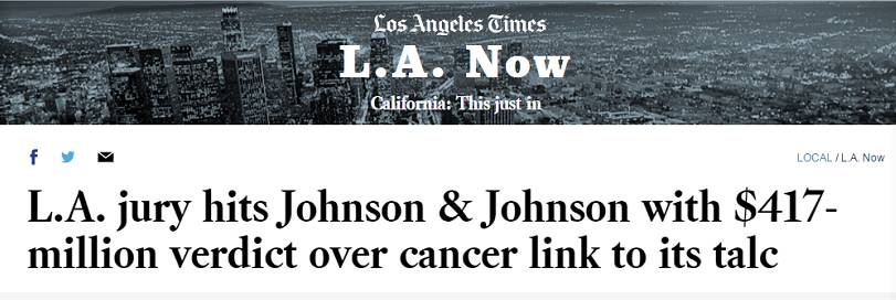 据美国《洛杉矶时报》8月21日报道,美国洛杉矶陪审团宣布,因未告知消费者使用爽身粉可能会引起癌症的潜在风险,强生公司须向一名因使用其婴儿爽身粉等含滑石粉卫生用品而患卵巢癌的妇女埃切维里亚(Eva Echeverria)赔款4.17亿美元(约合人民币27.8亿元)。