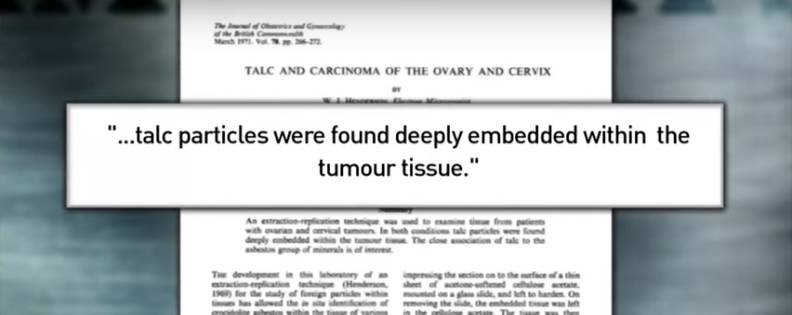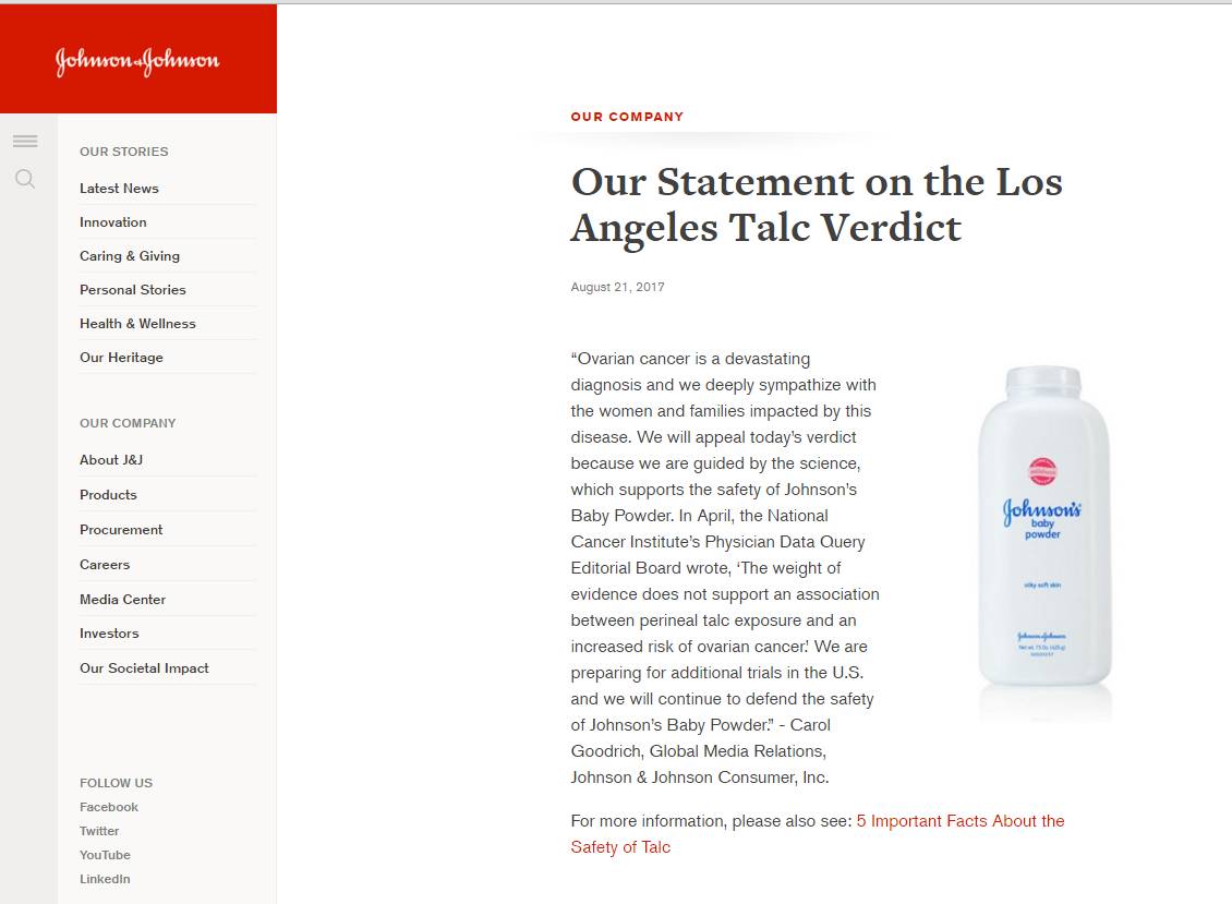 他对此也提出了另一份科学报告作为回应:早在1982年就有研究结果显示,曾经在私处使用强生爽身粉的女性患卵巢癌的几率会提升92%。当时进行这项实验的科研人员克莱默(Daniel W. Cramer)曾强烈建议强生公司在产品上标注警告,但是公司并没有这样做。