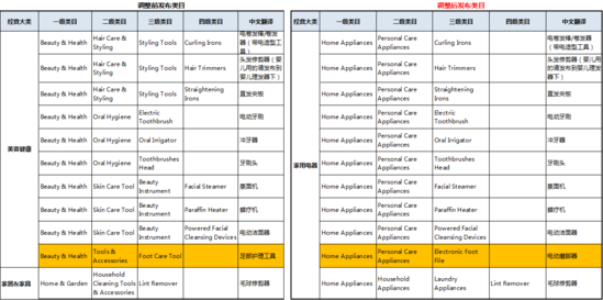 一、“美容健康”经营大类下的“电卷发棒/卷发器、头发修剪器、直发夹板、电动牙刷、牙刷头、冲牙器、蒸面机、蜡疗机、电动洁面器、足部护理工具”,调整至“家用电器”经营大类下的个人护理二级类目下;