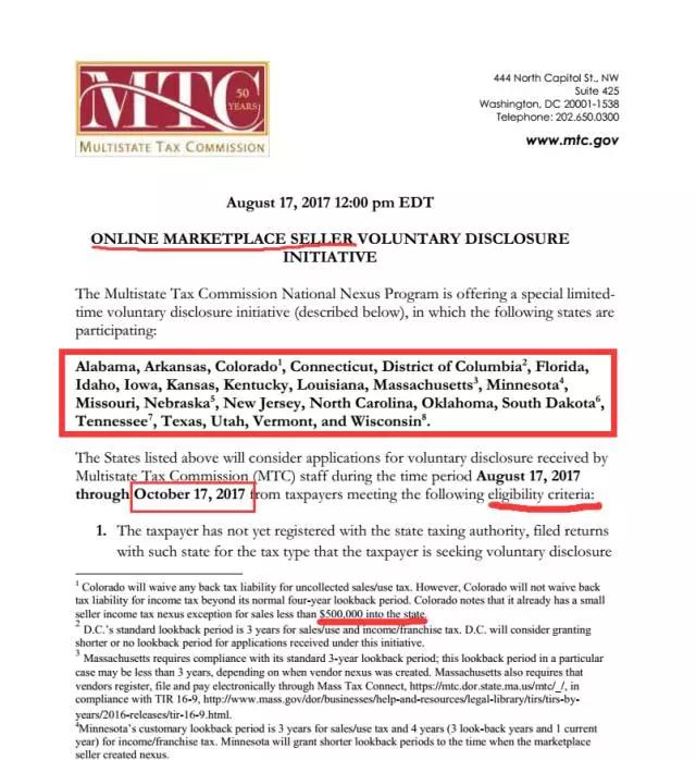 8月17日,美国24个州政府参与并透过美国跨州税收委员会(MTC)发布了一则针对电商卖家的税收计划,鼓励所有在线电商平台卖家在截止到2017年10月17日之前的3个月内主动填表申报税收豁免,对以往的没有缴纳的税款有条件地过往不究。否则,后期有可能面临重罚。