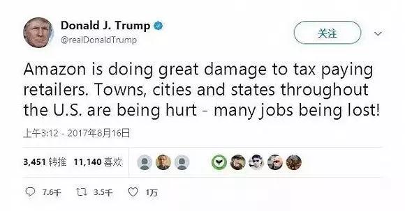 最近,特朗普通过推特狂喷亚马逊的老板贝索斯,上周发了一条推特说Amazon对零售商缴税这事造成重大破坏,还导致好多地方受伤害,损失了很多就业机会。虽然,他的逻辑在Mark看来不成立,Mark还没见过有了汽车后累死自行车车夫的事情,但之后还是直接导致亚马逊的股票狂跌了好多,充分证明了川普的神功盖世。